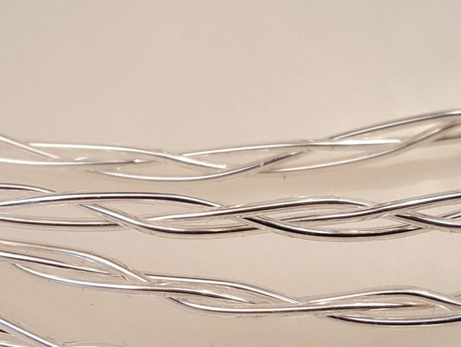 Verflochtene Leiter aus reinem Silbermassivdraht (0,7mm) mit strahlvernetzter Isolierung aus Teflonderivat.